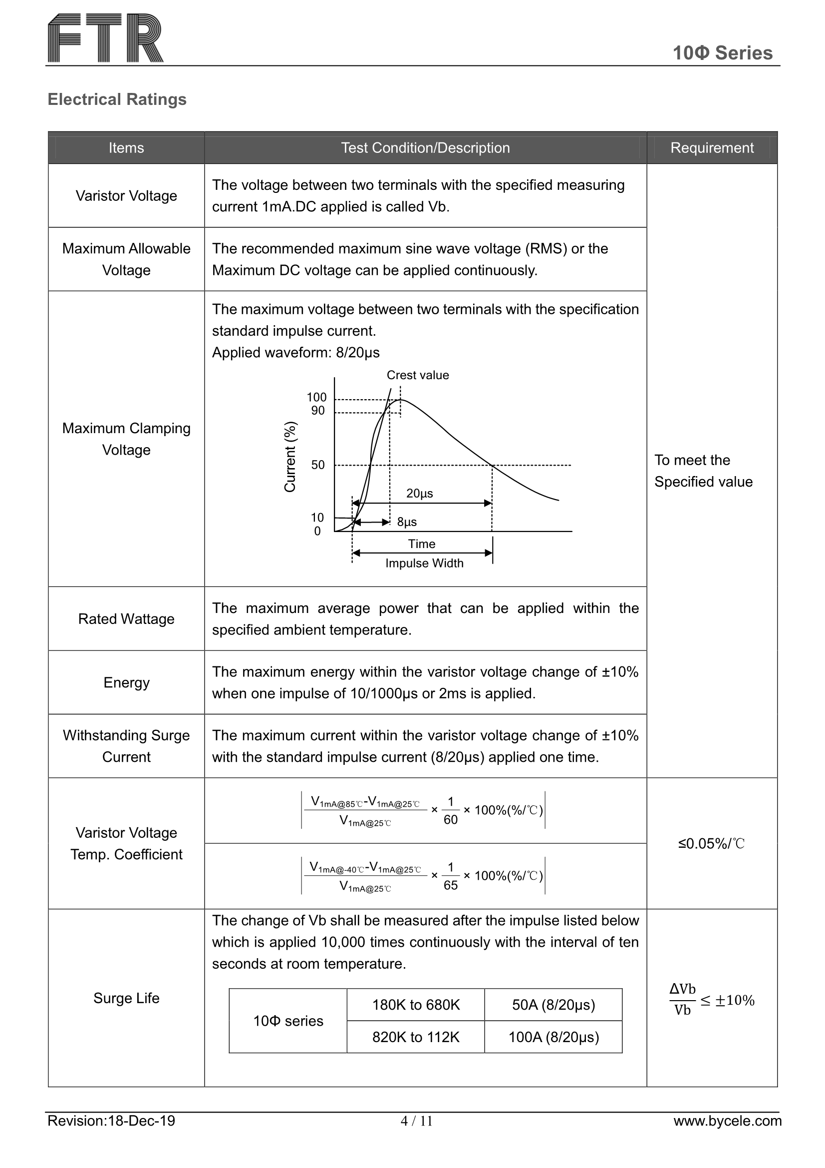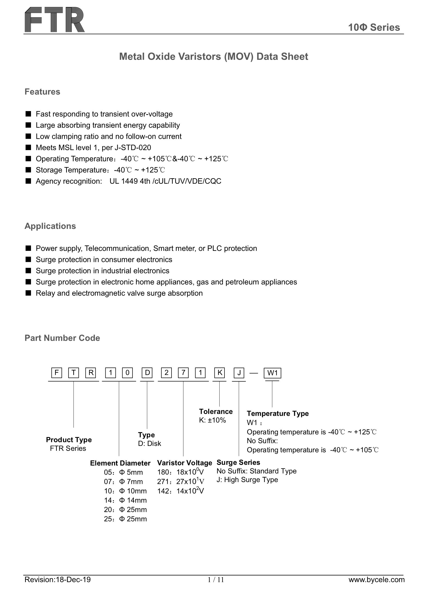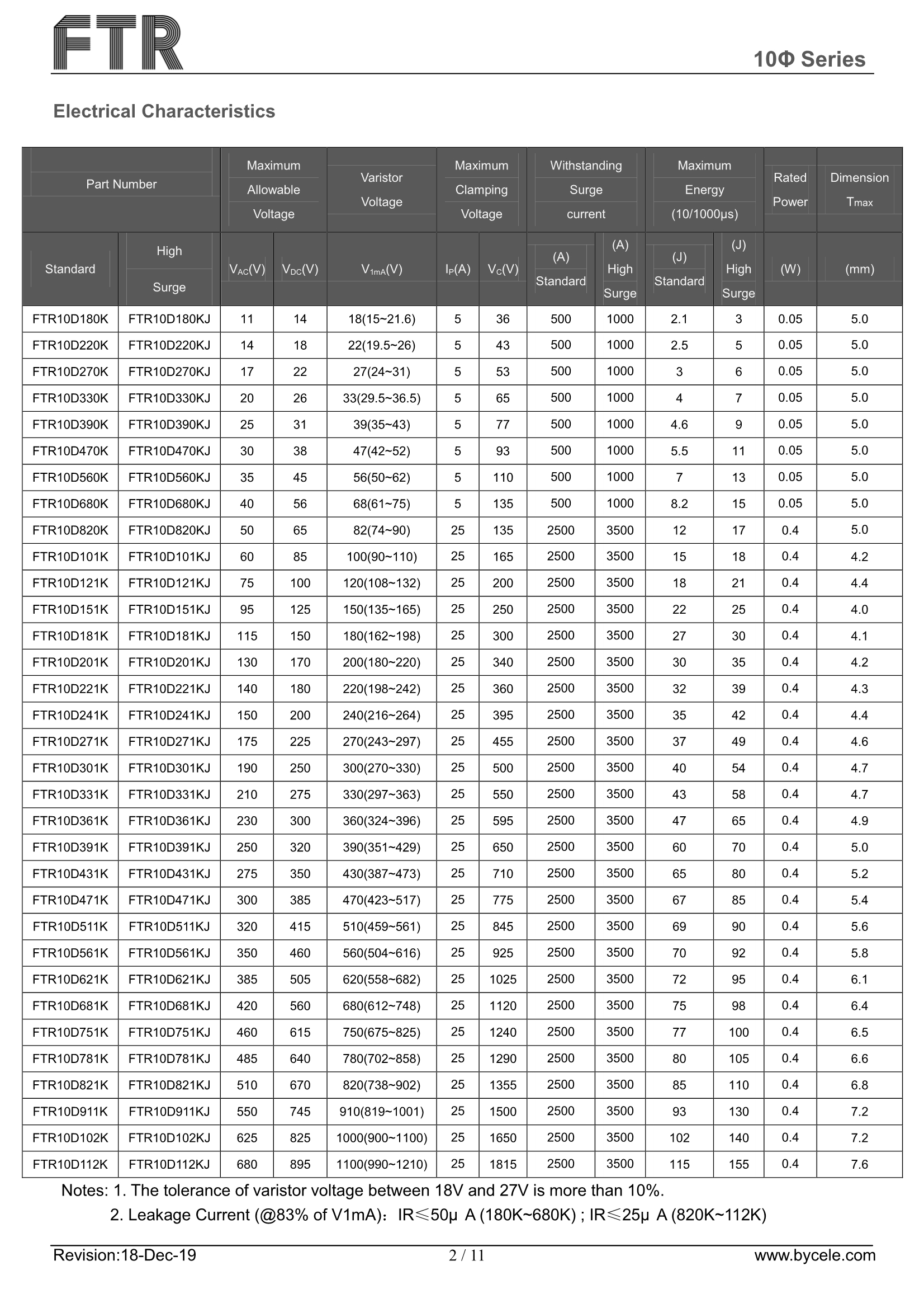 压敏电压: 18 - 1100V浪涌承受电流(8/20us): 500 - 3500A尺寸: 10mm