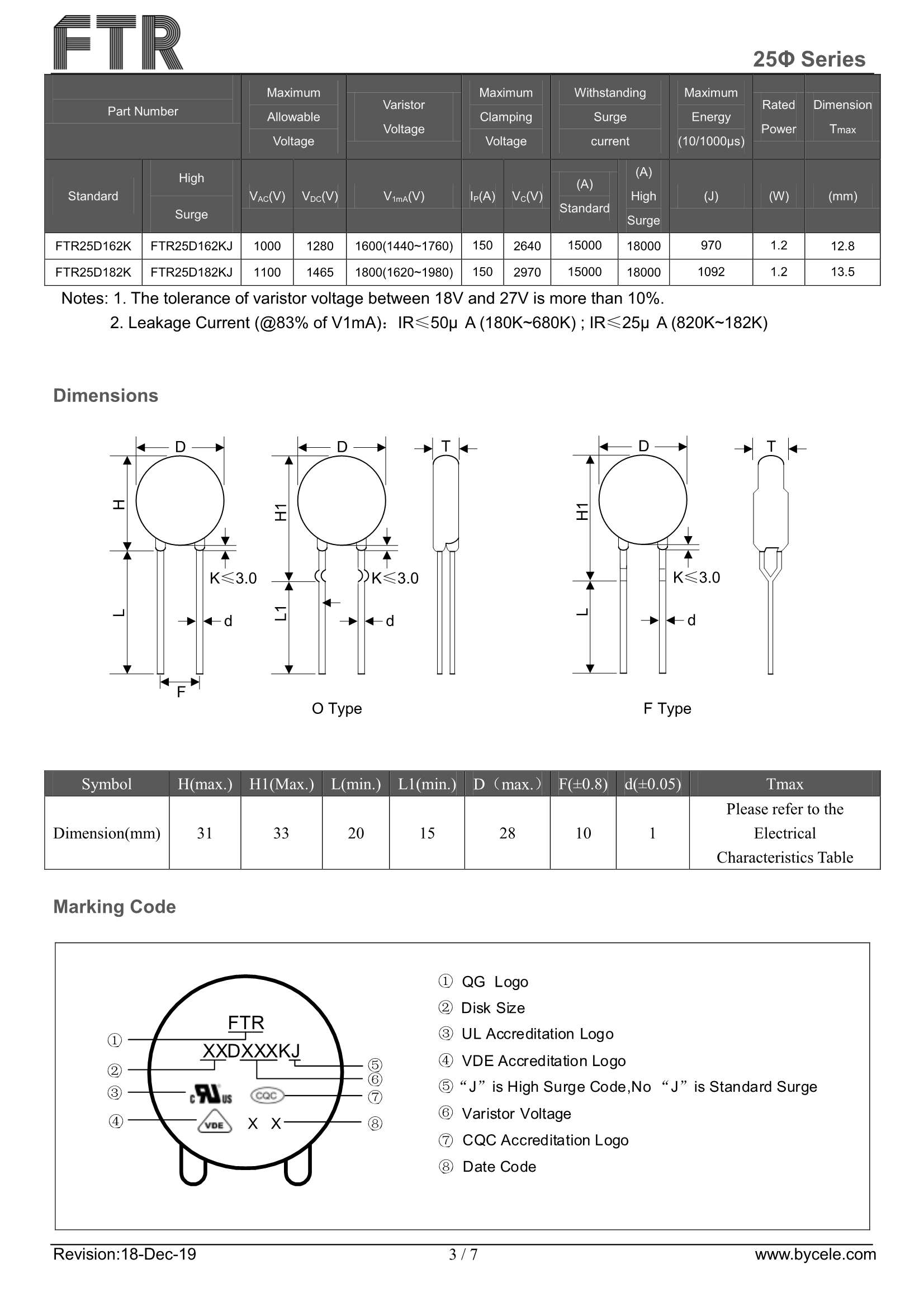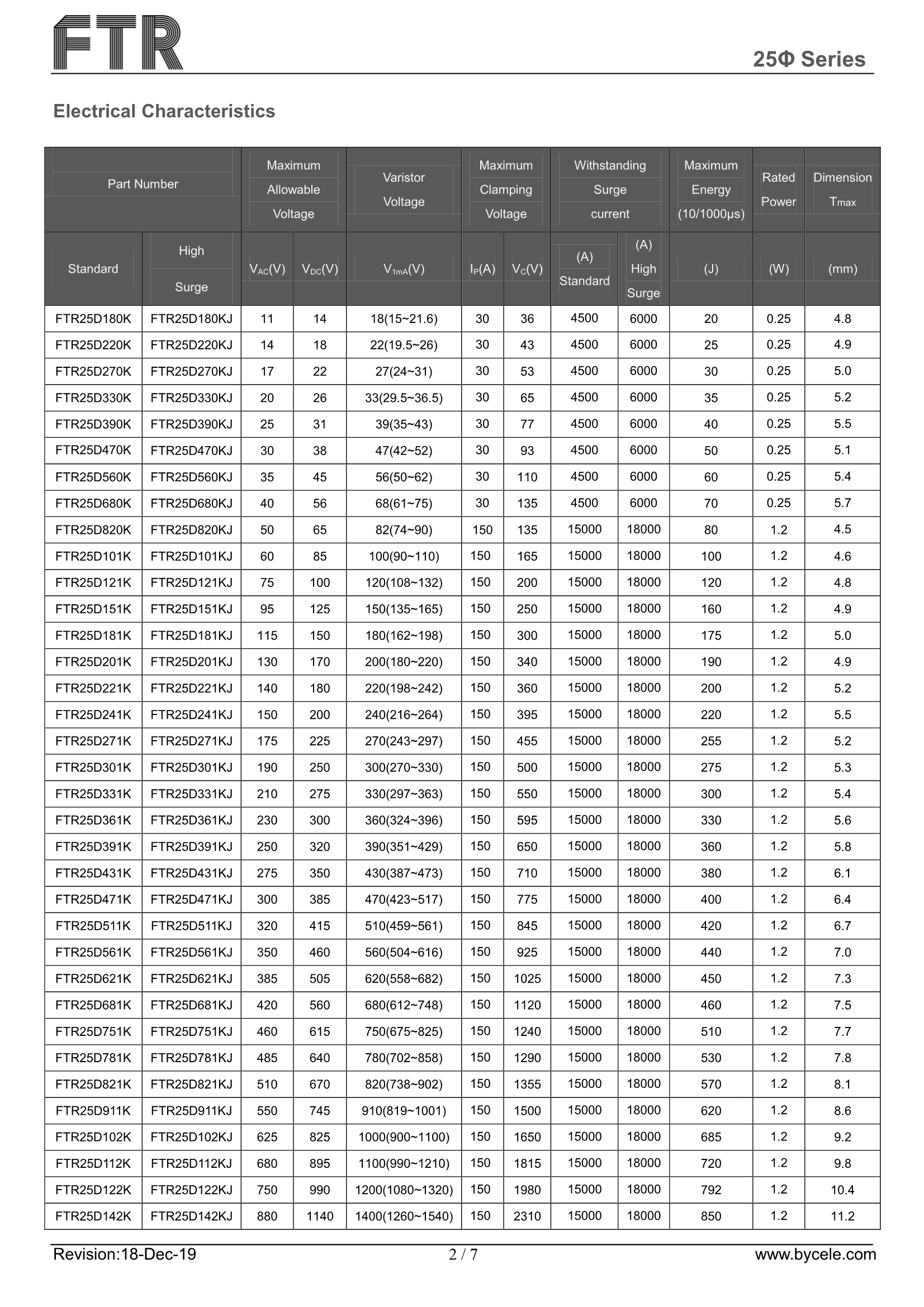 压敏电压: 18 - 1800V浪涌承受电流(8/20): 4.5 - 18KA尺寸: 25mm