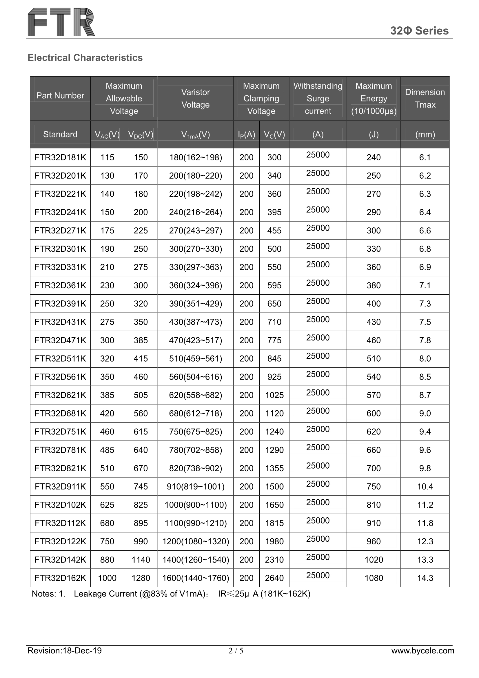 压敏电压: 180 - 1600V浪涌承受电流: 25KA尺寸:320mm